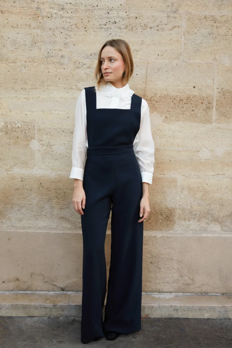 Combinaison marine à bretelles et boutons couverts au dos. Fermeture à zip sur le côté.