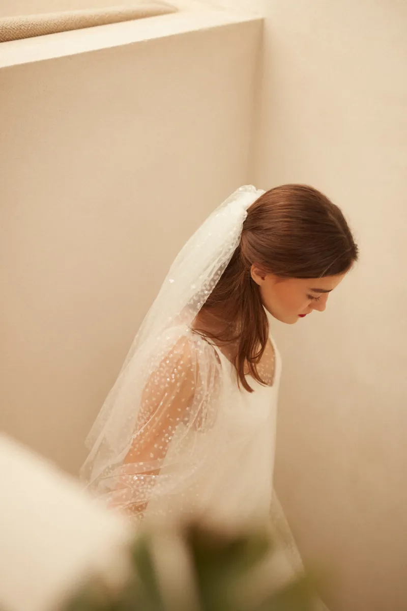On aime ce long voile et sa douce transparence en pluie de paillettes.
