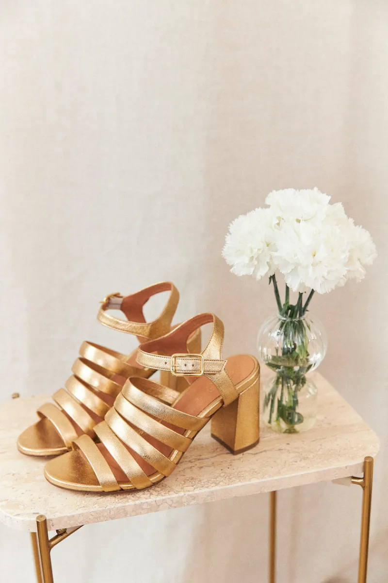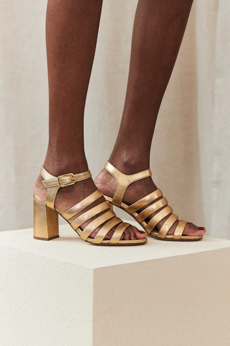 Escarpins à talon en chèvre métal doré, fermeture par une bride à la cheville avec une boucle dorée.