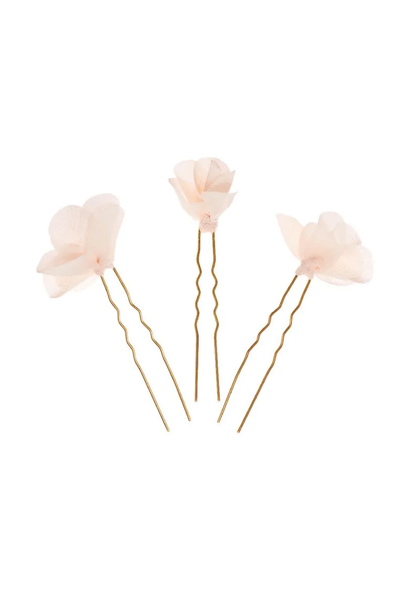 Lot de 3 ou 5 pics à cheveux dorés décorés de pétales d’organza rose pâle.