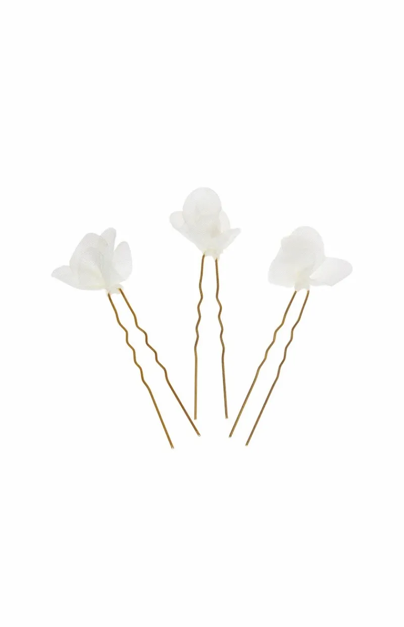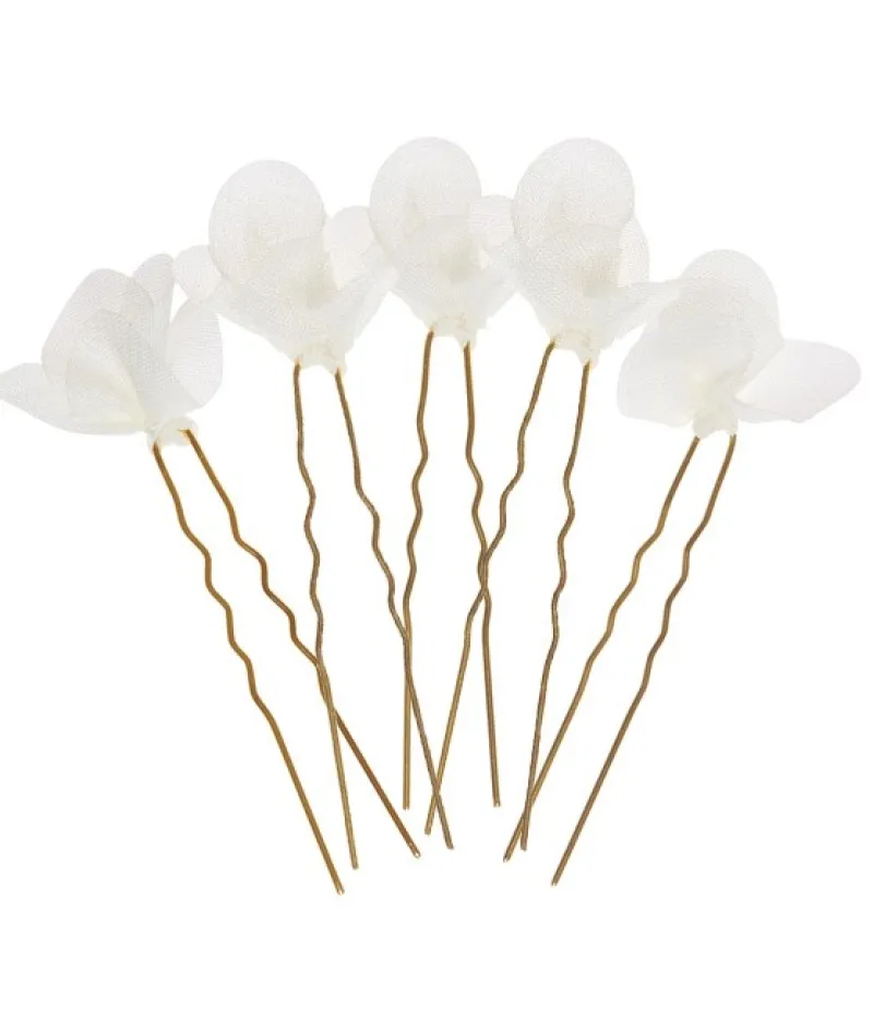 Lot de 3 ou 5 pics à cheveux dorés décorés de pétales d’organza ivoire.