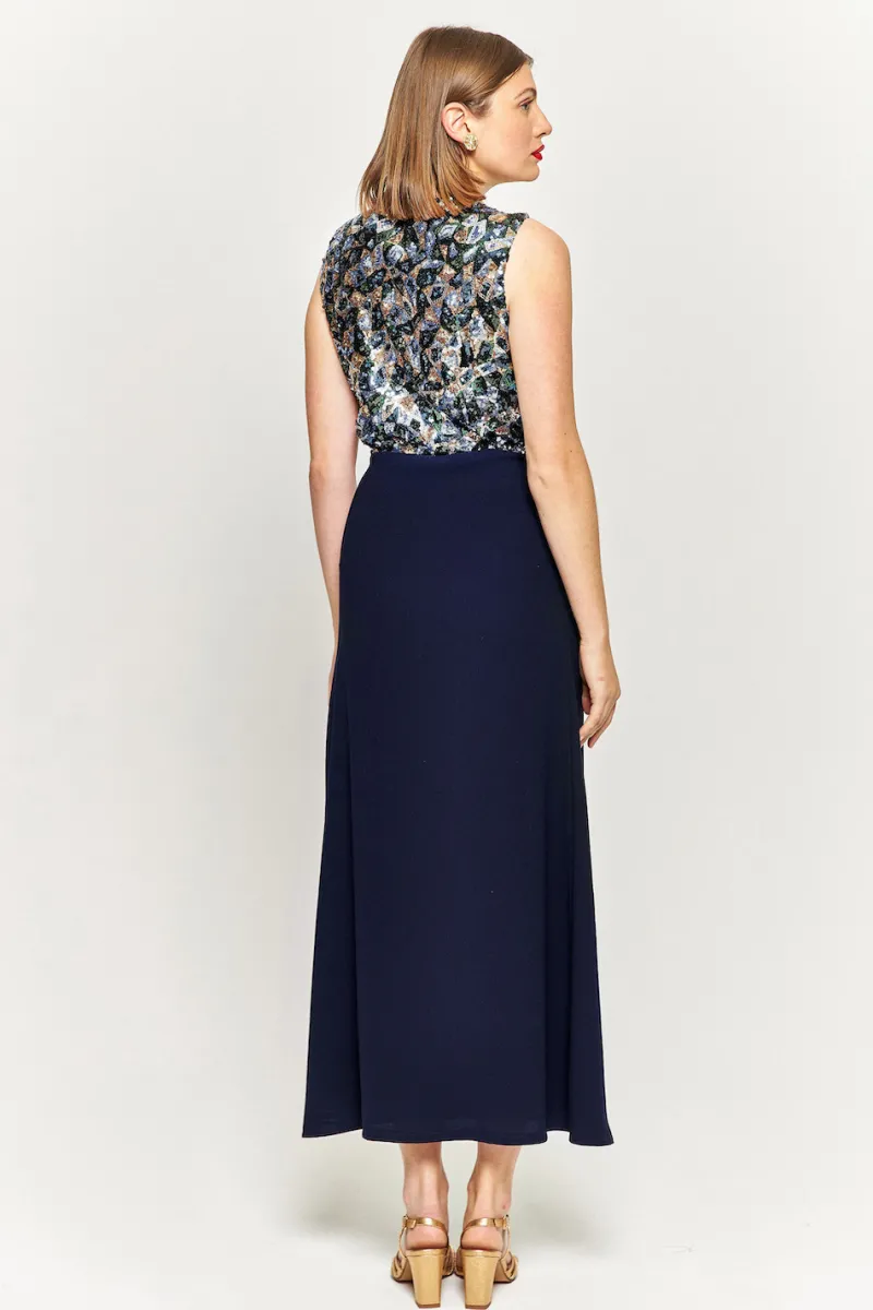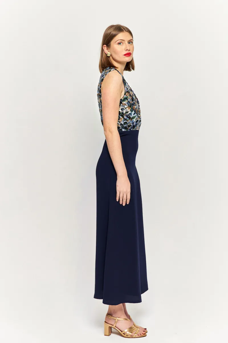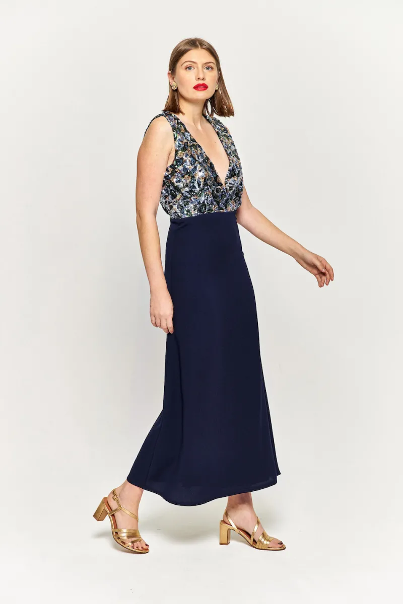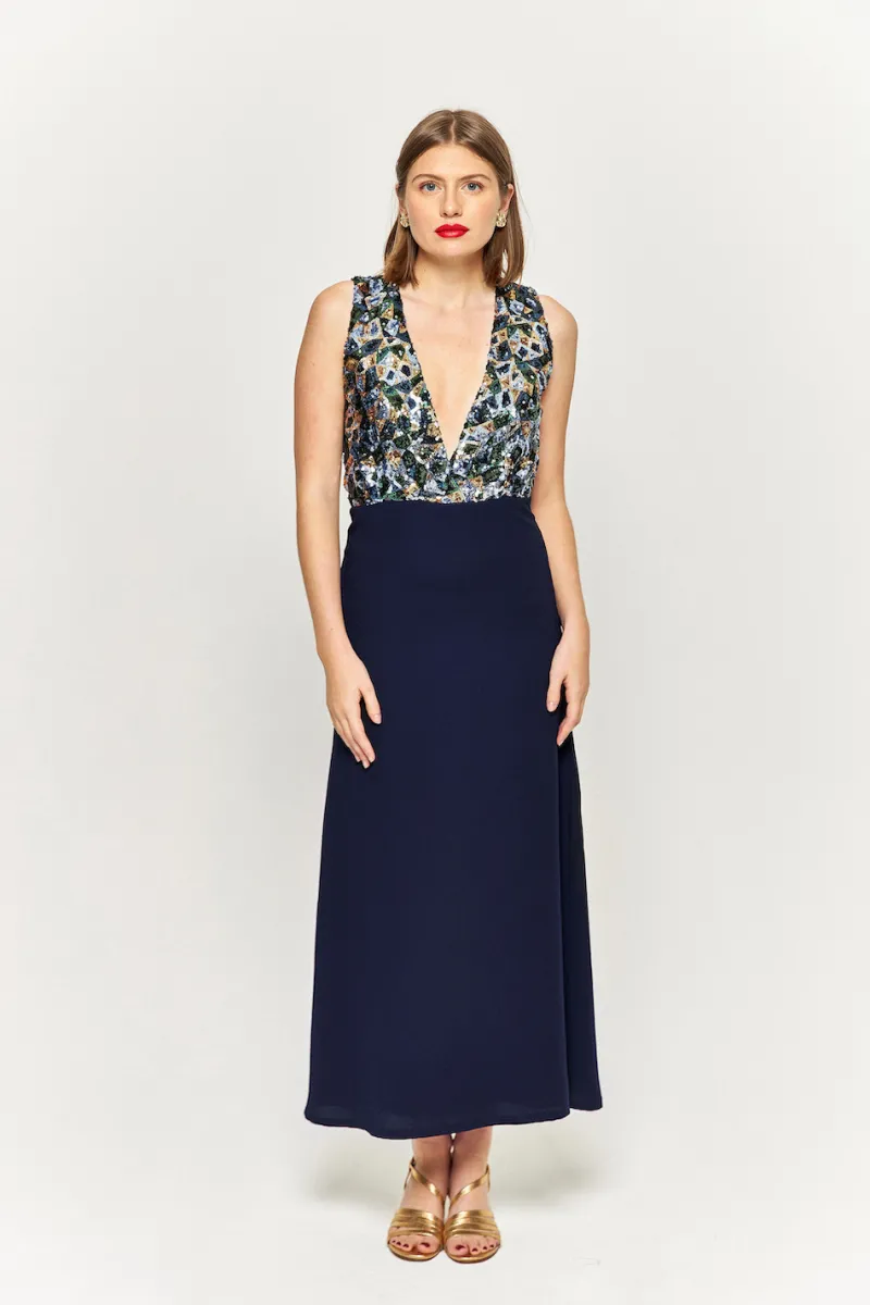 Robe longue sans manches à sequins et au décolleté plongeant. Fermeture zip au dos.