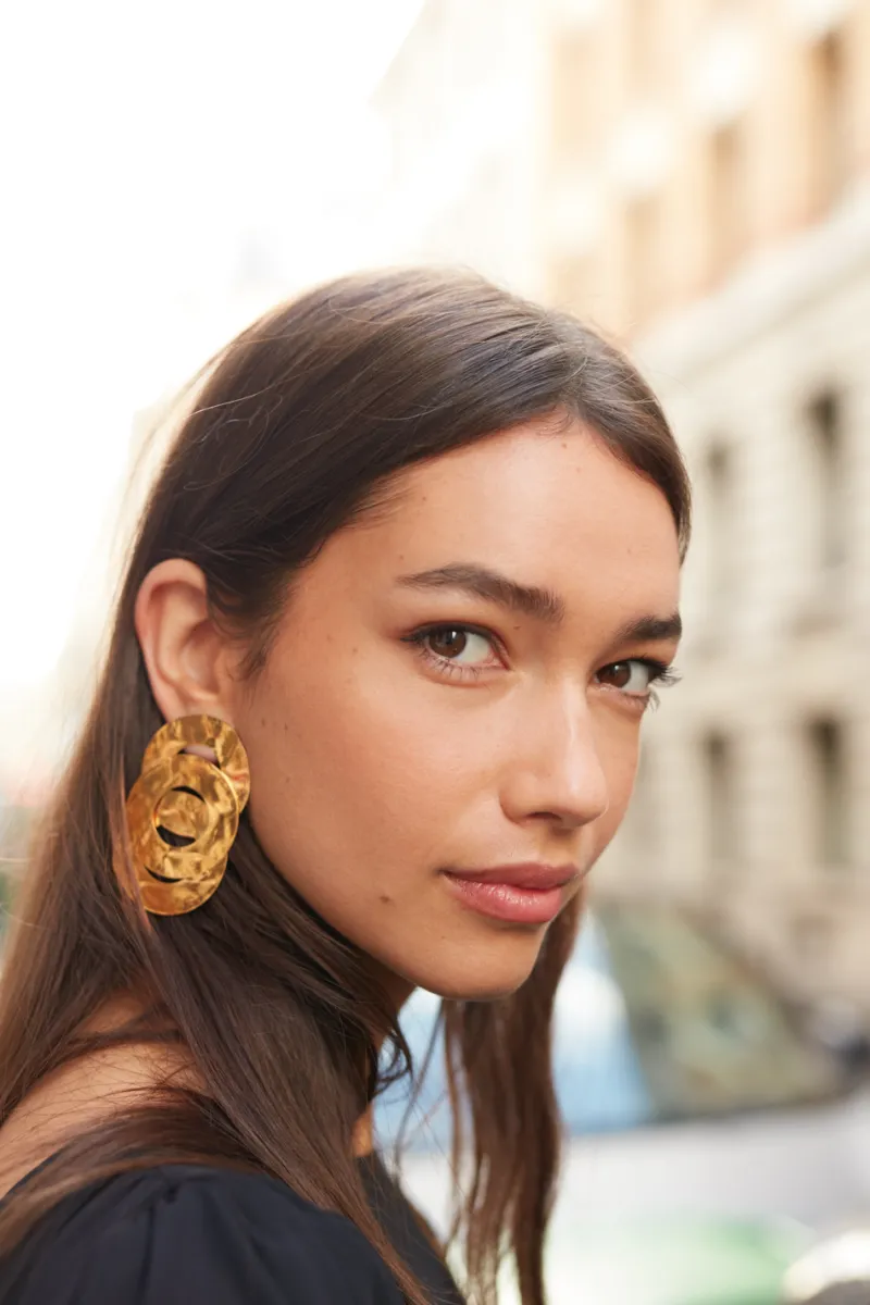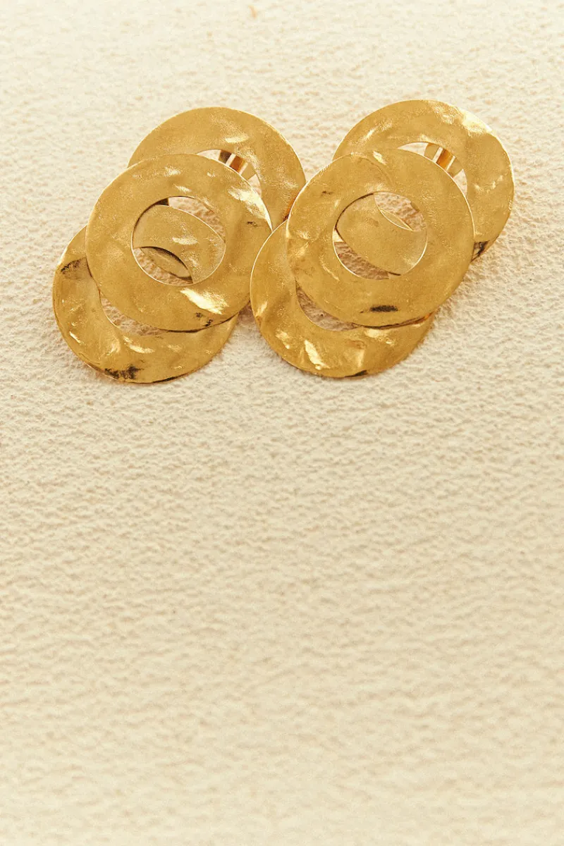 Boucles d’oreilles faites de trois anneaux superposés plaqué or.