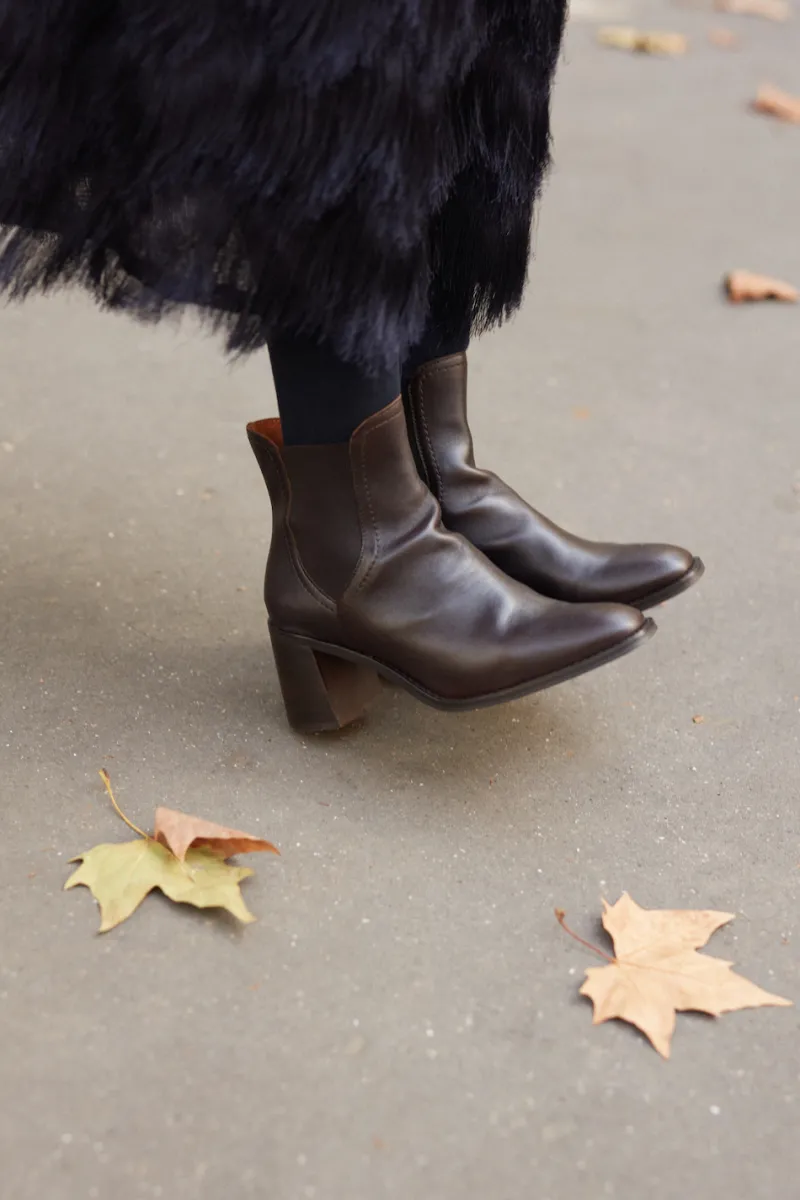 Bottines à talon en cuir de chèvre lisse marron foncé, élastiques sur les côtés.